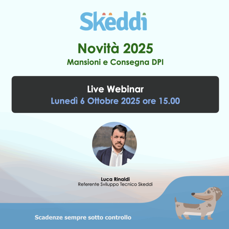 Webinar Skeddi: “Mansioni e Consegna DPI”: quali importanti aggiornamenti sono in arrivo? Siamo entusiasti di condividere le ultime novità invitandovi al “Webinar Skeddi: Mansioni e